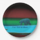 Un oso polar deambula por el hielo durante la larga noche polar; las auroras boreales en rojo y verde brillan a lo lejos. Añade tu propio texto.