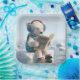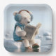 Un oso polar con barro azul y un chaleco se sienta sobre un pedazo flotante de hielo mientras lee un periódico titulado "Noticias Polares".