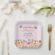 Celebrate your little one with this sweet “Our Little Wildflower” 1st birthday party paper plates, featuring a soft pink background and a charming border of colorful wildflowers and buzzing bees along the bottom. Your child’s name is displayed in a beautiful script font in a coordinating floral shade, while the party details are set in an elegant serif font for a timeless touch. Designed to be easy to customize, this plate is as practical as it is adorable.