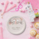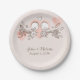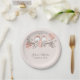 Una placa de papel bonita conveniente para muchas ocasiones y el personalizable con nombres o fechas. Dos pájaros se sientan en ramas de árbol con los corazones y flores en fondo del melocotón.