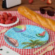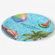 Sujete un inolvidable fiesta de piscina con este diseño de azulejos azul claro en el patio que incluye una palmera, una bola de playa, una sombrilla y un melón fresco.