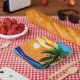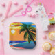 Platos de fiesta de cumpleaños. Silueta de palmeras de colores antiguos y olas oceánicas en una playa de arena artificial generaron obras de arte.