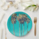 Placas de papel con una hermosa fotografía. Palmeras altas con largos baúles delgados frente a un hermoso cielo verde. Esquema de color retro. Relajante y relajante.