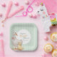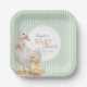 These charming baby shower Paper Plates feature a delicate vintage watercolor illustration of Mother Goose and Gosling, creating a warm and touching story of love and care. The delicate image is framed in an elegant oval border and set against a classic pastel green striped background, inspired by timeless nursery designs and fairy tales.