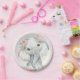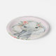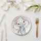 Plato de papel para baby shower de elefante hembra con elefante bebé lindo con flores en un bonito fondo rosa y dorado. Estos platos de papel de elefante se personalizan fácilmente con texto.