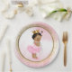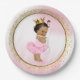 Platos de papel para baby shower de princesa con adorable bebé princesa afroamericana que lleva un precioso tutú rosa y collar de perlas sobre un hermoso fondo rosa y dorado. Estos adorables platos de papel para baby shower de princesa se personalizan fácilmente con texto.