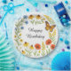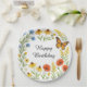 Este plato de papel para fiestas presenta un encantador diseño de acuarela digital de botones azules, vibrantes Susanas de ojos negros y flores de amapola rojas y audaces, todo sobre un fondo de hojas verdes exuberantes. Esta alegre disposición floral es perfecta para una fiesta de cumpleaños de verano o cualquier ocasión festiva. Está disponible como plantilla personalizable, por lo que puede adaptarla fácilmente a las necesidades de su fiesta única.