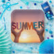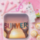 Manos levantando letras coloridas que deletrean "VERANO" contra un fondo vibrante de puesta de sol