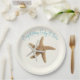 Placas de papel de estrella para una celebración boda. Personalizar con texto ligeramente curvo en la parte superior. La frase de ejemplo es "Felicitaciones" con los nombres de la pareja. El texto es azul acuático y el tipo de letra es alto, impreso y moderno. Una estrella marrón del mar y una estrella del mar blanco decoran el centro de platos blancos redondos o cuadrados.