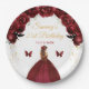 Este elegante y glamuroso plato de fiesta de cumpleaños presenta una hermosa princesa con el pelo castaño en un vestido de bola rojo oscuro. El texto combina el guión manuscrito y las fuentes sans serif modernas para un aspecto elegante y sofisticado. Los arreglos florales, mariposa y confitis dorada crean la mezcla perfecta entre rústico y moda. Gráficos de www.etsy.com/uk/shop/SunflowerDayLove