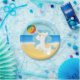 Un unicornio adorable de pelo azul jugando en la playa con una bola de playa. Perfecto para una playa infantil o un fiesta de piscina.