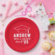 Las placas redondas de papel para graduación personalizado presentan un diseño rojo y blanco (¡se puede modificar a través de "Personalizar It!") con un tapón de graduación y texto personalizado para el nombre del graduado y el año de clase.