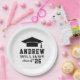 Las placas de papel redondeado para graduación personalizado presentan un diseño clásico de tipografía en blanco y negro (¡se puede modificar a través de "Personalizar It!") con un tapón de graduación y texto personalizado para el nombre del graduado y el año de clase.