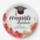 Clase de fiesta de graduación de placas de papel fiesta 2021 con un borde floral rojo exuberante y tipo de guión moderno ¡Grad! El contraste rojo y negro en negrita.
