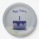 Una torta azul personalizado de cumpleaños con espolvorea en los lados y una vela encendida se sienta en un plato dorado en un mostrador cubierto de puntos de colores.