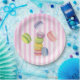 Platos de papel con un diseño acuarela de macarones dulces y deliciosos franceses apilados unos encima de otros y unos cuantos otros revoloteando. colores pastel bonito: violeta, verde limón, amarillo, rosa y azul. Sobre un fondo rayado rosado.