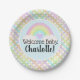Esta adorable acuarela, el plato de papel de color arcoiris pastel "bienvenido para bebé" con un adorno de gingham con arcoiris coincide con nuestra colección de productos de fiesta de ducha de bebé e invitaciones. Personalizar con el nombre del bebé.
