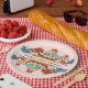 Platos de papel para fiestas de cumpleaños con una hilera de deliciosos quequitos con batidos y cerezas y deliciosas heladas. Ilustrado en un estilo retro clásico. Los colores son retro verde, rojo, azul y crema.