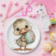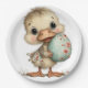 Un adorable patito bebé sosteniendo un plato de papel de huevo de Pascua