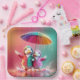 Dos adorables patos con impermeables coloridos se alinean bajo un gran paraguas vibrante durante una tormenta de lluvia