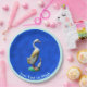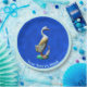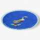 Perfecto para un fiesta. Un pato de madera tallada, pintado, con su pato, fuertemente curtido, sobre un fondo azul. Añade tu propio texto.