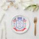 This patriotic bridal shower paper plate design features a watercolor crest with a light red white and blue patriotic crest with American flags and a blue bow. Text in the center of the crest says "Red, white and I do."