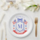 This patriotic bridal shower paper plate design features a watercolor crest with a light red white and blue patriotic crest with American flags and a blue bow. You can personalize with your monogram and name.