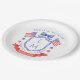 This patriotic wedding paper plate design features a watercolor crest with a light red white and blue patriotic crest with American flags and a blue bow. You can personalize with your monogram, wedding date and names.