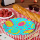 Este plato de papel tiene un divertido y divertido patrón abstracto de ovarios y círculos en colores brillantes. Diversión y festividad para fiestas, picnics, barbacoas, etc.