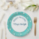 Platos fiestas editables con guion y letras seriadas sobre un patrón retro de estrella verde azulada y blanca sobre un fondo verde azulado ligero cambiable.