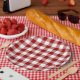 Los cuadrados rojos oscuros, blancos y rojos claros forman una estratagema búfala audaz. El patrón de gingham rojo y blanco me hace pensar en Navidades y en picnics de verano divertidos. Imagen creada digitalmente. Copyright © Claire E. Skinner. Todos Los Derechos Reservados.