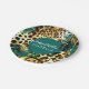 Platos de papel inspirados en safari con patrones de pelaje de animales, motivos de palmeras verdes oscuras y acentos de manchas marrones y parches negros – perfectos para fiestas WILD especiales.