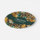 Platos de papel inspirados en safari con patrones de piel de animales, motivos de hojas verdes oscuras y acentos de manchas doradas marrones con parches negros – perfectos para fiestas temáticas de vida silvestre.
