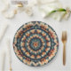 Un tejido geométrico vibrante irradia desde el centro, creando un intrincado diseño de mandala con varios colores, como el verde verde azulado, el marrón rojizo y el beige