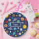 Celebra el sistema solar con este alegre plato de papel de fiesta de cumpleaños con tema en el espacio exterior. El planeta tiene un sol feliz, planetas felices (Mercurio, Venus, Tierra, Marte, Júpiter, Saturno, Urano y Neptuno), así como un planeta enano feliz Plutón, asteroides y estrellas. Personalice la placa con el nombre de su joven amante del espacio.