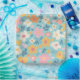 Diseño floral rosa, dorado y blanco de verano sobre fondo acuático.