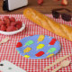 Cocitos de hielo de fruta en un patrón. Personajes de caricatura sonrientes. Placas de papel decorativas.