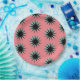 Patrón retro de explosión atómica divertida a mediados de siglo en color turquesa y negro sobre fondo rosa.