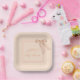 El tema de la ducha de bebé Bow se pega con un nombre sencillo en un fondo de polka-punto. Acento de soplo en el melocotón de gingham pastel.