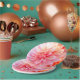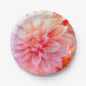 Una armoniosa mezcla de colores y elegancia con grandes y vibrantes dahlia colocadas sobre un suave fondo rosa melocotón.