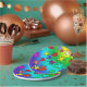 Los rompecabezas coloridos juntan las piezas de la fiesta de cumpleaños temática, pedazos coloridos del rompecabezas, colores son turquesa, azul, amarillo, púrpura, lila y rosa