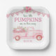 Estos adorables platos de papel cuadrado de 7" con un camión color de agua rosado cargado con calabazas rosas y blancas y la fecha de ducha/rociado son perfectos para celebrar a tu ser querido y a sus niñas trillizas que pronto nacerán en una ducha/rociada de bebé. Su dulce diseño es tradicional y moderno. Se verán fabulosos en tus mostradores, bar y mesas.