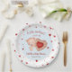 ¡Un poco de amor está en camino! Trae el sentimiento más adorable a tu ducha de bebé con este querido plato de papel con la temática de los bebés en rojo, azul y beige. Con un adorable oso bebé sosteniendo una galleta con forma de corazón dulce, pequeños corazones alrededor. Es perfecto para tu sesión de febrero de género neutro o para un niño con ducha alrededor del Día de San Valentín. Personalice fácilmente el texto o deje algo en blanco. - Kate Eden Art