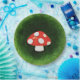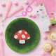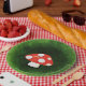 Un lindo ilustracion de un hongo rojo visto. El fondo es una textura verde acariciada, el color que recuerda a un bosque verde y exuberante donde se encuentran estos adorables hongos pequeños. La seta de toadstool es un símbolo mágico místico que puede ayudar a añadir brillo y misterio a tu hogar y tu vida.