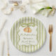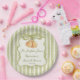 The perfect pair pear Sage green stripes retro elegant bridal shower monogrammed paper plates, retro bridal shower personalized paper plates, fall bridal shower personalized table decor, earthy stripped bridal shower plates, pear bridal shower, yellow bridal shower paper plates, grand millennial bridal shower personalized party supplies printed paper plates, coquette bridal shower personalized custom paper plates the perfect pear bridal shower printed paper plates