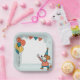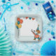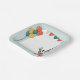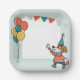 Diseño de placas de papel divertido que exhiben un perro de dibujos animados con globos coloridos, ideal para fiestas y reuniones.