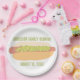 Crear platos de fiesta personalizados para perros calientes personalizados para las cocinas, reuniones familiares, concursos para comer perritos calientes y más. Estas placas tienen un ilustracion de un hot dog con un pepinillo de deleite y tu propio texto personalizado en verde deleite en la parte superior e inferior.