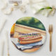 Pon tu nombre/nombre del evento en este plato de papel listo para picnic con un hot dog y bebe en una mesa de picnic.