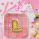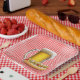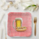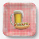 Perro caliente y jarra de cerveza en un fondo blanco y rojo de gingham. Se puede cambiar el fondo.