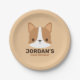 Un bonito diseño para alegrar el día. Este diseño presenta un lindo perro corgi con nombre personalizado en sans modernos marrones estilo serif tipo de letra sobre fondo marrón claro. Las fiestas de cumpleaños son perfectas para los niños.